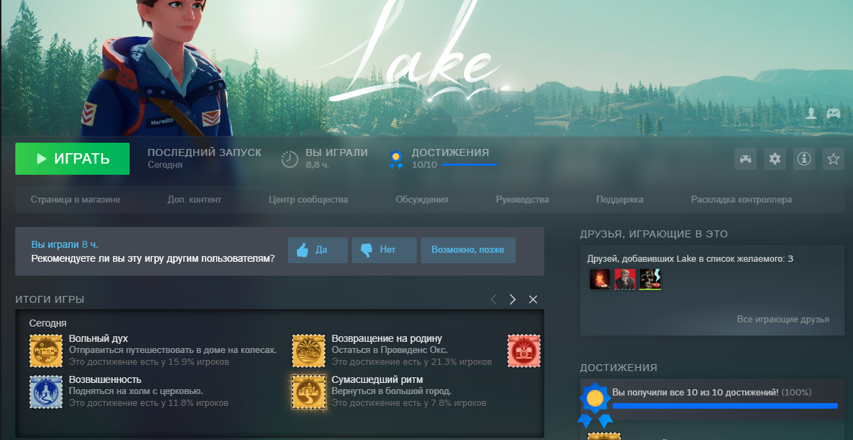 Меланхоличная история о том, как девушка устав от мегаполиса решает отдохнуть и сменить обстановку и отправляется на 2 недели в тихий американский городок у озера,где она выросла и где живут ее родители. Здесь она устраивается на работу почтальоном,заменяя временно отца который уехал в отпуск во Флориду вместе с ее мамой. Ну и собственно дальше разворачивается история. Геймплей медитативный, по сути симулятор почтальона. Развозим грузы,знакомимся и общаемся с местными. Атмосфера удаленности от мегаполиса со всеми вытекающими тут чувствуется. По истечении 2 недель я колебался с выбором остаться здесь или вернуться к суматошной жизни городского жителя. Из минусов это техническая часть. Впервые встречаю, чтобы в инди игре было столько проблем. Сначала был черный экран в стартовом меню после заставки. Помог перезапуск. Причем такое повторялось иногда при новом запуске игры. Дальше был рассинхрон между речью и тем, что происходило в игре. Иногда фразы вообще не озвучивались, иногда озвучивались уже после окончания беседы. Звук периодически вообще может пропасть. Здесь помог лок на 60 фпс, т.к. без ограничений игра видимо не способна справиться. В остальном мне понравилось. https://i.postimg.cc/CxLpcxRF/Lake.png |