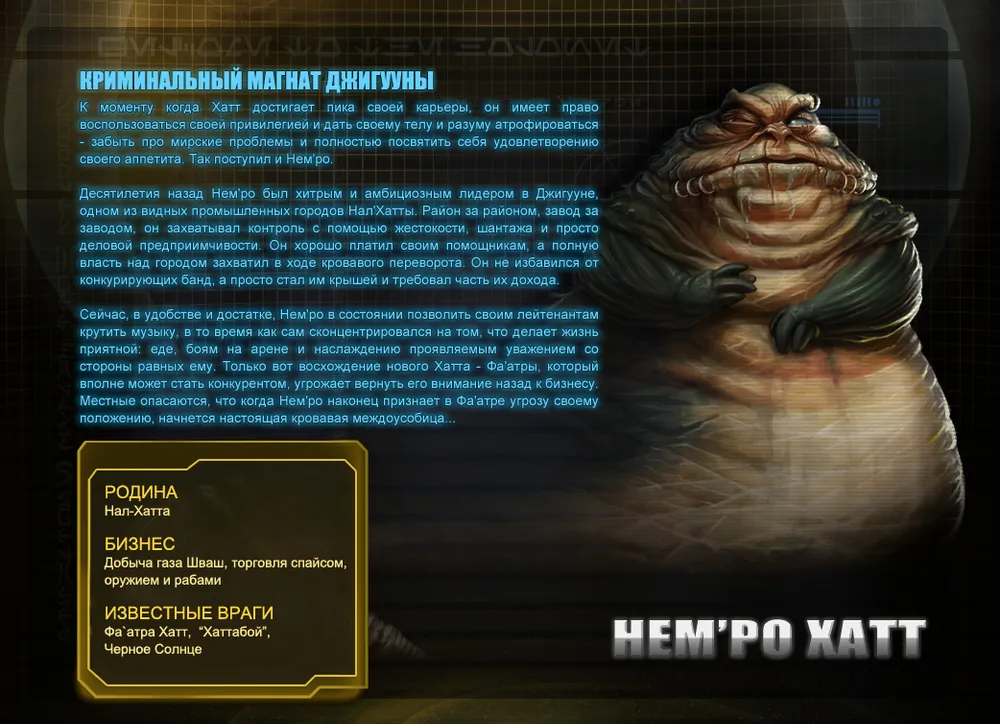 Скрытый текст: РОДИНА: Брентаал ДОСТИЖЕНИЯ: Нашла давно потерянную планету Тайтон, Стала самым молодым Великим Магистром за всю историю Ордена НАЗНАЧЕНА НАГРАДА: 100 миллионов кредитов за живую или мертвую. ГЛАВА ВЕРХОВНОГО СОВЕТА ДЖЕДАЕВ Скрытый текст: Мастер Сатель Шан, известная своей мудростью и сильной связью с Силой, является голосом и душой Ордена Джедаев. Она прямой потомок Бастилы Шан, легендарного Джедая, которая сражалась с Дартом Реваном несколько веков назад. В отличие от своего дерзкого и заносчивого предка, Сатель, которая предпочитает чтобы к ней обращались по имени, обладает приятными манерами и дружелюбным характером. Этот расслабленный и не предвзятый характер может ввести в заблуждение, т.к. не соответствует ее истинной силе и целенаправленности. Мастер Сатель много раз противостояла мощи темной стороны и при этом выжила. Будучи Падаваном, Мастер Сатель храбро сражалась с возрождающейся Империей Ситхов, сыграв ключевую роль в нескольких важных сражениях последней войны. Она заслужила свое место среди Джедаев, когда нашла давно потерянную планету Тайтон и помогла основать там новый Храм Джедаев, в замен разрушенного на Корусанте. С момента подписания Республикой перемирия на условиях Империи, Мастер Сатель без устали следила за тем, чтобы хрупкий мир не был нарушен, предотвращая многочисленные попытки возобновить конфликт. Однако Мастер Сатель очень хорошо знает о том, что тьма и свет не могут вечно сосуществовать в мире. Новая война с Ситхами маячит на горизонте — и на этот раз Джедаи должны одержать победу. Нем‘ ро Хатт Скрытый текст: РОДИНА: Нал-Хатта БИЗНЕС: Добыча газа Шваш, Торговля Спайсом, Торговля Оружием, Торговля рабами ИЗВЕСТНЫЕ ВРАГИ: Фа‘ атра Хатт, «Хаттабой», Банда «Черное Солнце» Криминальный магнат Джигууны К моменту когда Хатт достигает пика своей карьеры, он имеет право воспользоваться своей привилегией и дать своему телу и разуму атрофироваться — забыть про мирские проблемы и полностью посвятить себя удовлетворению своего аппетита. Так поступил и Нем‘ ро. Десятилетия назад Нем‘ ро был хитрым и амбициозным лидером в Джигууне, одном из видных промышленных городов Нал‘ Хатты. Район за районом, завод за заводом, он захватывал контроль с помощью жестокости, шантажа и просто деловой предприимчивости. Он хорошо платил своим помощникам, а полную власть над городом захватил в ходе кровавого переворота. Он не избавился от конкурирующих банд, а просто стал им крышей и требовал часть их дохода. Сейчас, в удобстве и достатке, Нем‘ ро в состоянии позволить своим лейтенантам крутить музыку, в то время как сам сконцентрировался на том, что делает жизнь приятной: еде, боям на арене и наслаждению проявляемым уважением со стороны равных ему. Только вот восхождение нового Хатта — Фа‘ атры, который вполне может стать конкурентом, угрожает вернуть его внимание назад к бизнесу. Местные опасаются, что когда Нем‘ ро наконец признает в Фа‘ атре угрозу своему положению, начнется настоящая кровавая междоусобица... Генерал-губернатор Килран Скрытый текст: РОДИНА: Дромунд Каас ДОСТИЖЕНИЯ: Герой битвы при Корусанте, Подавил восстание на Тогруте ЧЕРТЫ ХАРАКТЕРА: Патриот, Высокая харизма, Интеллект гения, Энофил Корусантский мясник Культурный, хитрый и конкретно жестокий Райкус Килран является возможно ве