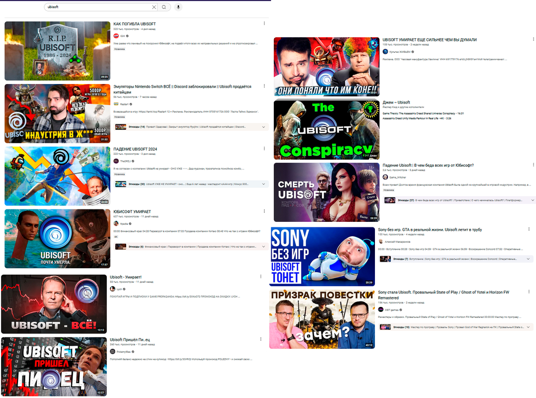 Добавлено через 8 минут Зашел инкогнито в браузер, разлогиненным зашел на ютуб и просто написал в запросе "Ubisoft". Да, кинуло ссылку на оффканал и пару видосов с их канала выдало, но вот вся остальная выдача: Скрытый текст: Сплошь эксперты с мировым именем рассказывают, что всё. :)) Потрясающе. |