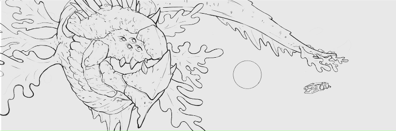 Сначала мы, то есть художники, получаем краткое описание истории, которое изображение события должно будет передать. В данном случае это водный космодракон, который витает в космосе.
