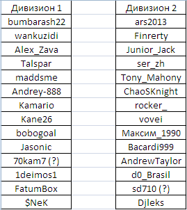 Провел жеребьевку. Извиняюсь, что не стал заморачиваться с трансляцией. Те кто в одинаковых строчках (например, ars2013 - bumbarash22, Finrerty - wankuzidi итд) были в одной корзине. Всего их было 13. Новичков распределил по статистике онлайн-дивизионов. У d0_Brasil и De1mos она выглядела получше, поместил их в "более сильную" корзину новичков. Так же двое помеченных вопросительным знаком - люди, которые до сих пор не добавили меня в друзья. Даю время до вечера, дальше придется принимать какие-то меры за невыполнение правил. В общем-то, можно начинать играть