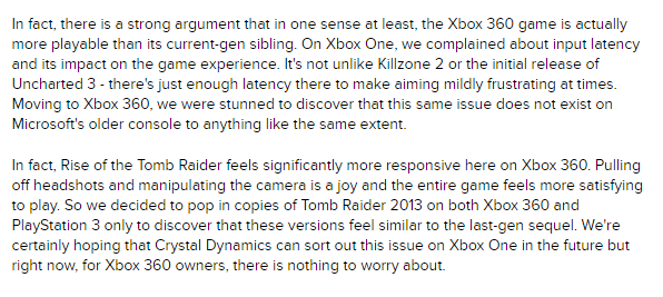 В абсолютном большинстве разницы в прицеливании нет (с поправкой на различные общие конструкции аналоговых стиков геймпадов обеих консолей). Зато есть очевидная более высокая подвижность вражин в версии игры на XO. И еще как раз на 360-ке нефиговый такой инпут-лаг частенько ощущается. Учитывая еще и регулярные фризы и просадки на той же Сибирской базе, а также порой зверский тирринг, трындеть что-то там о более высокой стабильности и лучших ощущениях от игры на 360-ке... Они там, случаем, версии для обеих платформ не перепутали ли? Мда-а... Не к слову, на 360-ке все кат-сцены - записанные заранее ролики, на XO все они рендерятся в реальном времени.