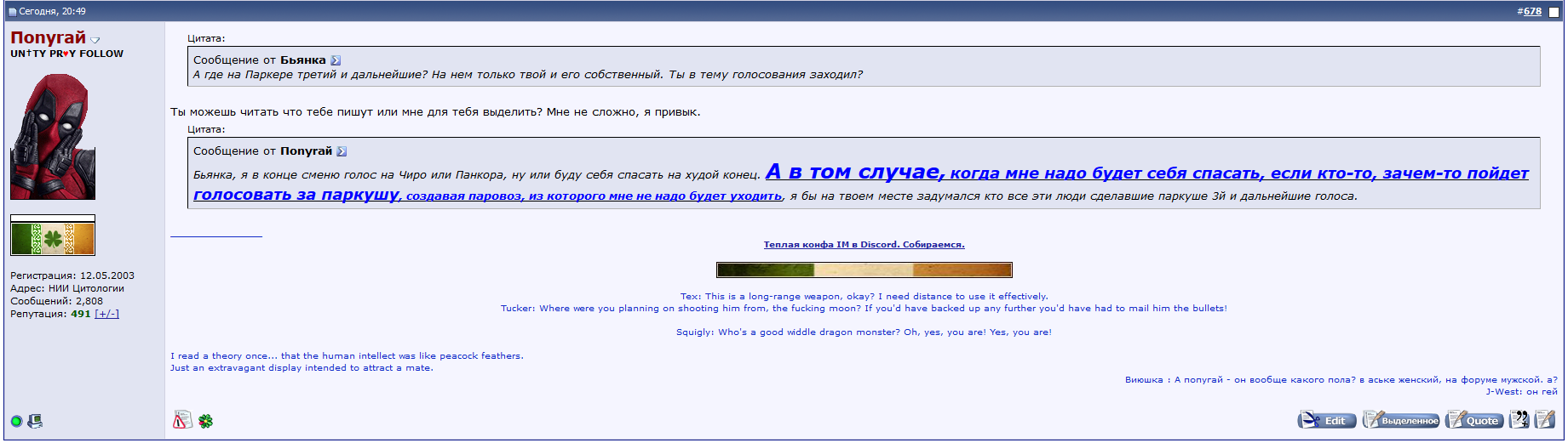 ![]() ☻ Забить винт старой инфой так, чтоб не влезала новая, а попытки обновления старой вызывали конфликты - в принципе единственно пока известный нам вариант развития. ©ShadowJack Tex: This is a long-range weapon, okay? I need distance to use it effectively. Tucker: Where were you planning on shooting him from, the fucking moon? If you'd have backed up any further you'd have had to mail him the bullets! Squigly: Who's a good widdle dragon monster? Oh, yes, you are! Yes, you are! Виюшка : А попугай - он вообще какого пола? в аське женский, на форуме мужской. а?
