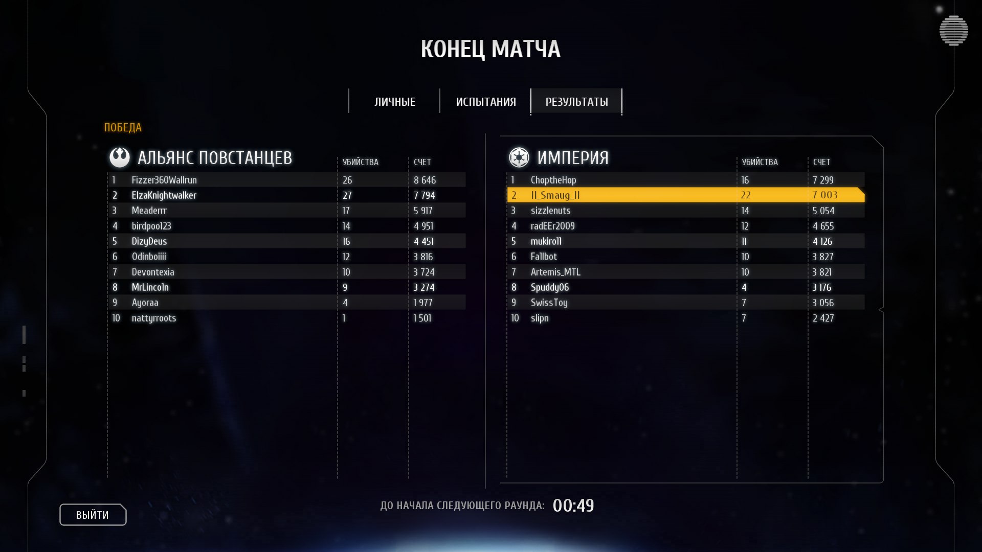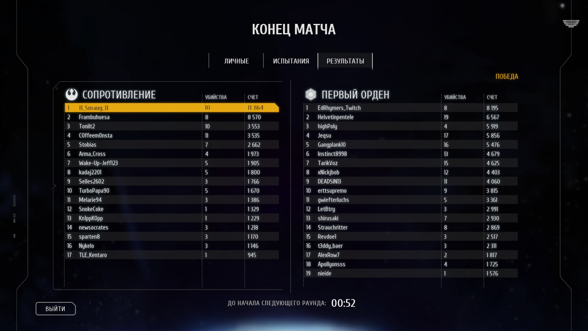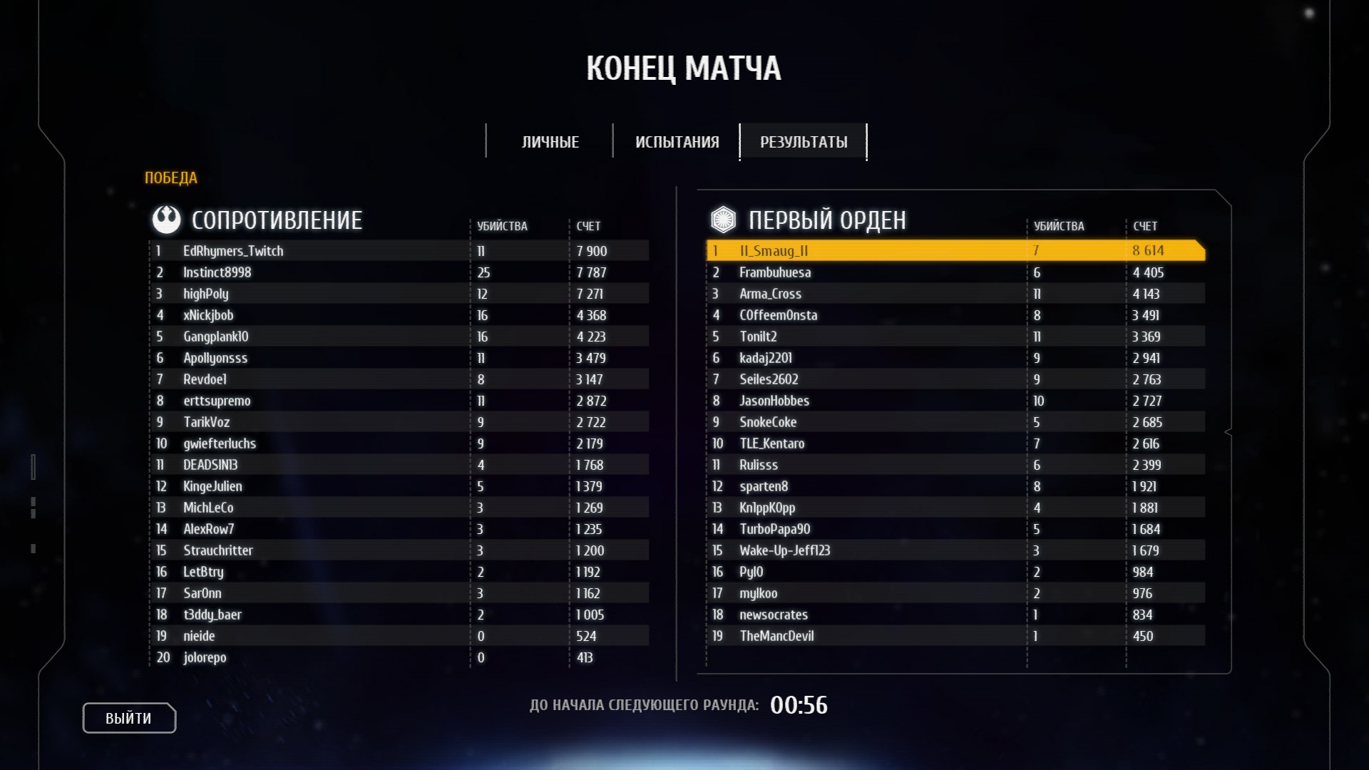 Спокойно занимаю 1-3 места, не донатил и не собираюсь. Всё спокойно можно выбить самому. Огромная просьба тех кто не играл - не осуждать игру, она действительно годная и донат там не решает. Как вариант можете попробовать 10-часовой Ориджин Аксес вариант. Не пугайтесь что вас сразу разносят в пух и прах, это нормально. Всё таки народ уже изучил карты, оружие, героев и т.д. И более уверенно играет. Хоть и тащил в 1 части дико, но вторая не сразу далась. Пришлось чуточку изучить игру, но как втянулся - спокойно начал нагибать. Скрин 1 - Серия килов в 32 рыла, техника или герои использованы не были, сам хз как так получилось.) Не кэмперил и не выжидал, снайперкой тоже не пользовался. Играю в основном тяжелым классом. Скрин 2 - яркий тому пример, каким бы нагибатором вы не были (хоть обмажтесь донатом и лутбоксами) без годной тимы не выиграть, одному не затащить. Скрытый текст: Скрытый текст: Ну и немного среднестатистической игры. Хочу также добавить, что гриндить ничего особо и не надо, игра не принуждает к донату. За 10 часов пробника апнул 11 лвл, накопил более 30к кредитов, кучу крафтовых-деталей, апнул 2 карточки до 2 уровня, 1 выпала из 3 (лутбоксы дикий рандом, шанс того что тебе выпадет то что тебе нужно - крайне мал) Скрытый текст: И запомните одну вещь. В игре решает скилл. Вы можете обмазаться лутбоксами - лучше от этого играть вы не станете. Нужно изучить карты (их много и они большие) оружие (их по 4 штуки пока, но каждая ведет себя по разному), обвес к оружию, звездные карточки, героев, технику. Без этого вас сольют на раз два. А пока вы все это изучите и более менее начнете играть, все уже подкачаются и будут с вами на равных в плане карточек и прокачки. Последний раз редактировалось Джек_из_Тени; 15.11.2017 в 07:08. |