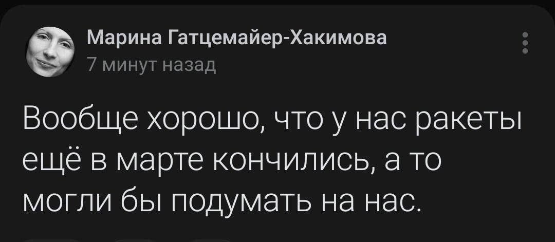 Паранойя штука страшная) Хотя не понятно чего обычный мирняк так боится, когда все прекрасно знают что лупят не по домам ими, а по военным объектам и сейчас еще по энергосистеме. |