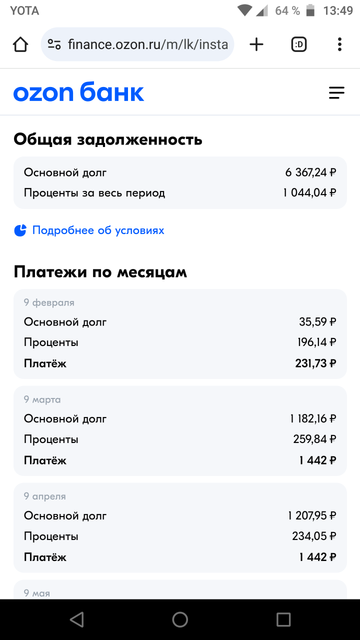 Раньше на Яндексе сплиты брал. На второй месяц гасил все и не парился. В прошлом году на Озон подсел, бывает с рассрочкой пришаливаю. Под конец декабря, в очередной раз все погасил. Но тут же понабрал карт памяти и прочей мелочи. Пару раз 1-2к скинул. Обязательный платеж все так же показывает 9 февраля. Сегодня опять сдачу скинул, в досрочную сумму, для ровного - было 12564, закинул 1440, а в сумме оказалось 13632. Куда 300+ре профукалось и где все эти крайние даты смотреть? Вижу только 9 февраля и все. С поддержки только вода и все. Пару раз срался, но бесполезно, никаких конкретных цифр, что почему и куда они так и не предоставили. |