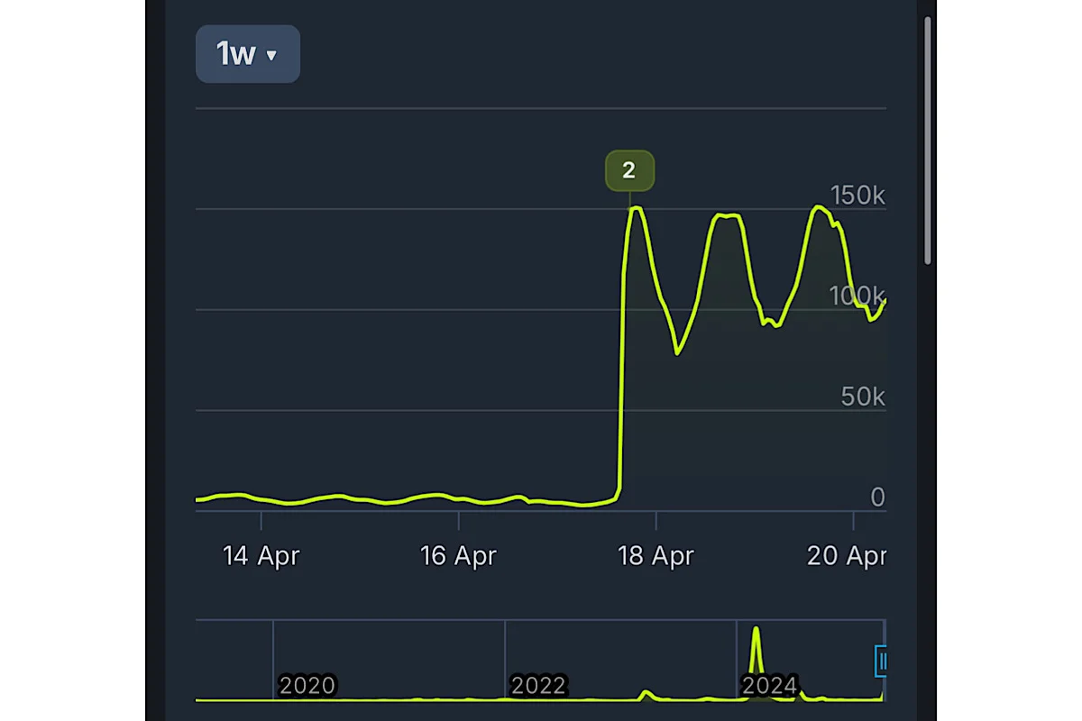 Отметим, что максимальная отметка составляет более 264,7 тыс. Произошло это в феврале 2024 года — в день релиза. Далее онлайн начал стремительно падать и не превышал отметку в 5 тысяч с ноября прошлого года.