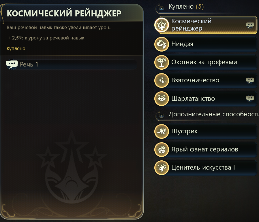 Wolfsheim, у меня есть перк "космический рейнджер". позволяет апать урон от навыка красноречия)) Это единственный перк из всех реально интересно придуманный. Он процентно апает урон, когда красноречие апаешь, при этом само красноречие увеличивает дамаг людям противникам, так же процентно. Но я так и не понял что им мешало дать напарникам какие-то доп перки, которые бы компенсировали бы слабые стороны персонажа, это такой косяк, что слов нет. Могли бы например Наилзу дать перк инженера, Инес перк медика, она же полевой медик едрить ее... Роботу Вэл. тоже могли бы подогнать навыки связанные с медициной или еще чем-то, вообще это можно было бы выбирать, но они это слили. И вот это вот "персонаж это запомнит" в общении... эм и че? Я вообще не понимаю как это влияет хоть на что-то.