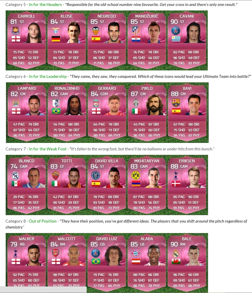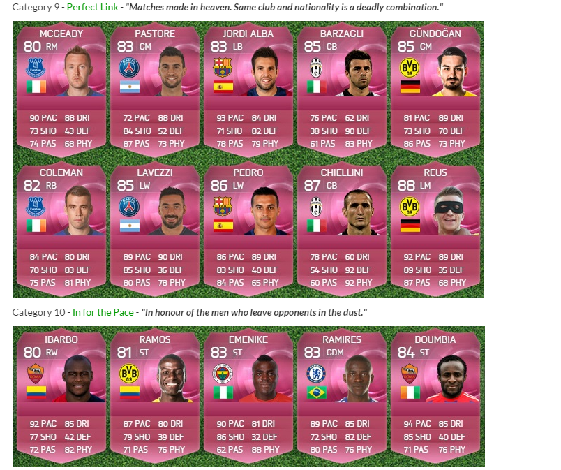 Это игроки команды недели, определяемой EA. Эта команда составляется из наиболее ярко выступивших футболистов в играх национальных чемпионатов (в редких случаях - за матчи в кубках и турнирах сборных). При чем платиновыми являются только те футболисты, карточки которых были выпущены именно в ту неделю. Более старые карточки останутся с прежним окрасом.