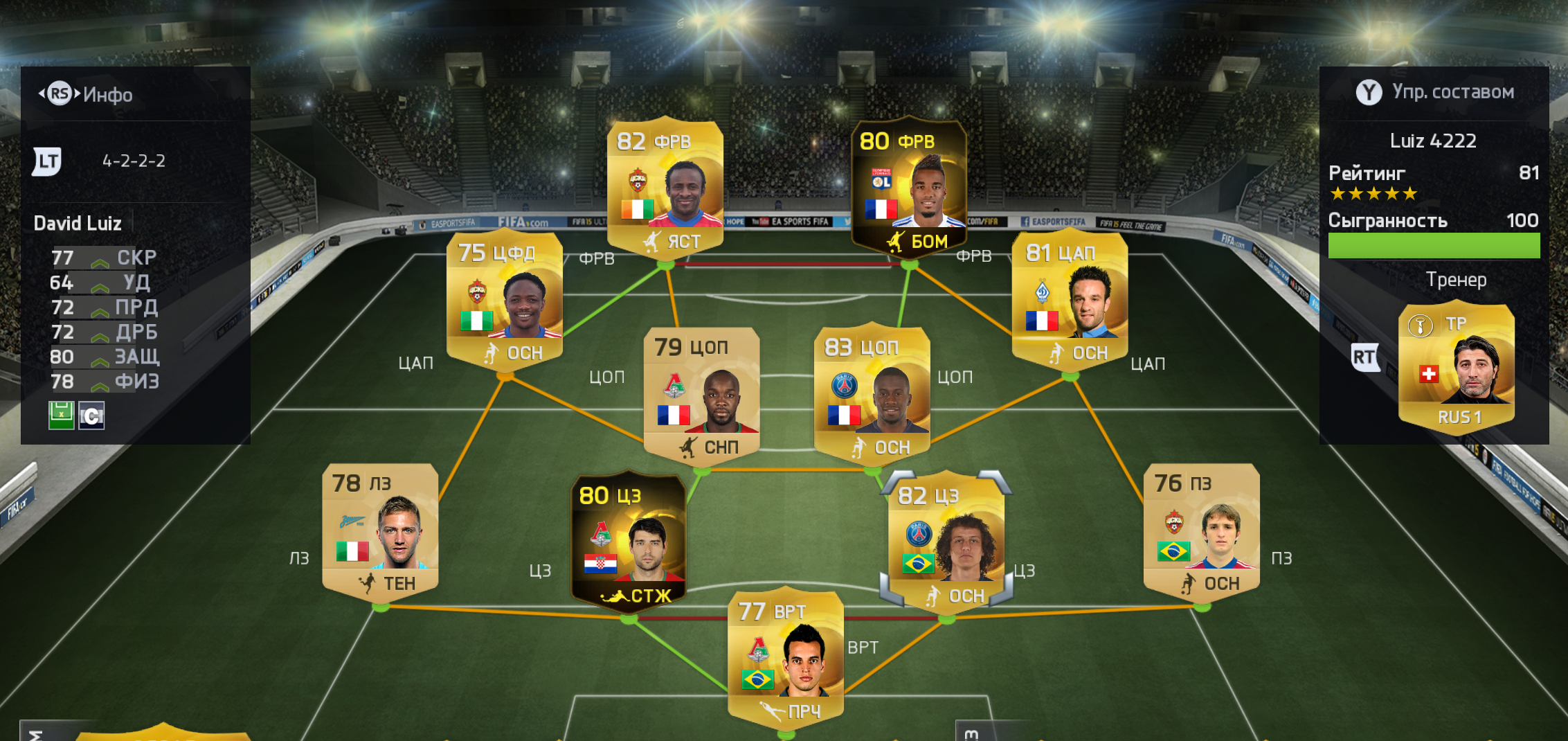 Состав: вратарь: Сиригу защита: Кришито (лз), Давид Луиз (цз), Маркинос (цз) (ну можно Тьягу Силву, но он стоит немало), Халк (пз) (хорошо играет в защите, мощный и при атаке помогает) лучше Фернандеса в любом случае, хоть и сыгранность у него 7 из-за позиции. полузащита: Данни (лп), Матуиди (цоп), Вальбуена (цап), Тошич (пп) атака: Муса и Думбия И еще лучше не менять игроков по отдельности для фитнеса, а сделать себе недорогой второй фитнесс состав и играть им к примеру в офлайн сезонах. Последний раз редактировалось KOT_71; 23.10.2014 в 12:31. |