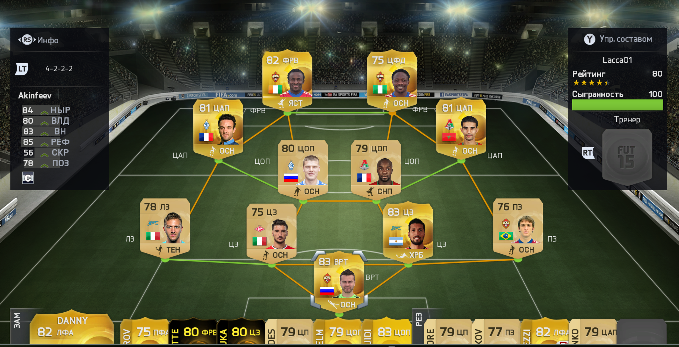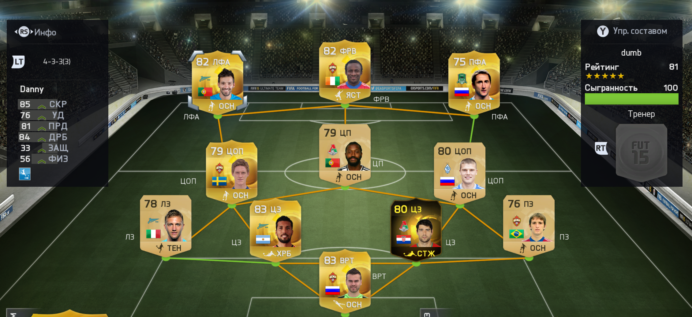 1. Скрытый текст: ЦЗ Были с вариативностью с Чорлукой ИФом как и у тебя. Обрати внимание на Боккети. Многие считают его лучшим защитником рфпл за счет скорости, так что если будут проблемы с зонами пробуй его. 2. Скрытый текст: Вместо Быстрова ессно Халк(продал его, поэтому ща не видно) Ну цопы там вариативно, опять же с Диаррой и тд. Дани мне не понравился, моменты порет один за другим, Халк хоть и помедленей, но хотя б забивает. Тут стоит отметить ЦП Фернандеша. Рулит. Многие это отмечали когда советовали. И да это так. 3. Но потом я всяко разно при помощи сторожил наковырял вот такую, которой и пользуюсь сейчас. Скрытый текст: Матуиди монстр, забивает больше чем оба ЦАПа. Луиз вычищает защиту норм, хоть и без скорости. Лаказетти и сам забивает и Думбию нормально снабжает. По твоей схеме обязательно попробуй вместо Вальбуйны Буссуфу. Они схожи по характеристикам, но Вальбуйна какой то кривой у меня всегда, Бу как то лучше по мне. Как то так. Последний раз редактировалось Azkiy; 23.10.2014 в 13:12. |