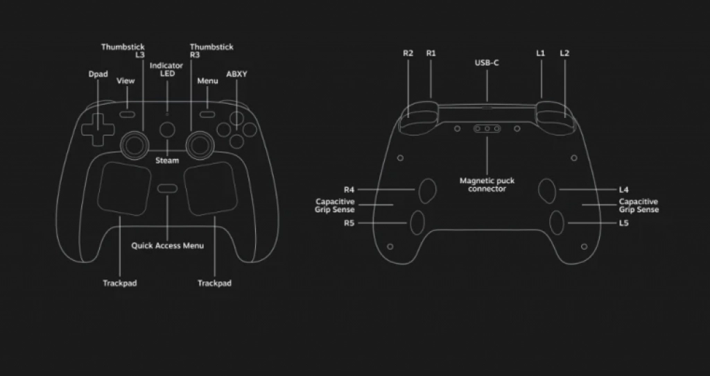 Элементы управление: кнопки (A, B, X, Y), крестовина, аланалоговые триггеры, левый и правый бамперы, кнопки «Вид» и «Меню», кнопки Steam и «Меню быстрого доступа», четыре назначаемых кнопки хвата.