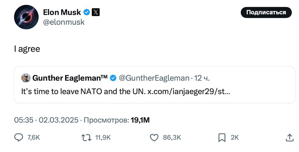 Депутат Европарламента Аатола (от Финляндии) сообщил что США дали Европе 3 недели, чтобы согласовать капитуляцию Украины. В случае саботажа со стороны Европы, США угрожают вывести свои войска из Европы и предоставить Европе самой заниматься своей безопасностью.