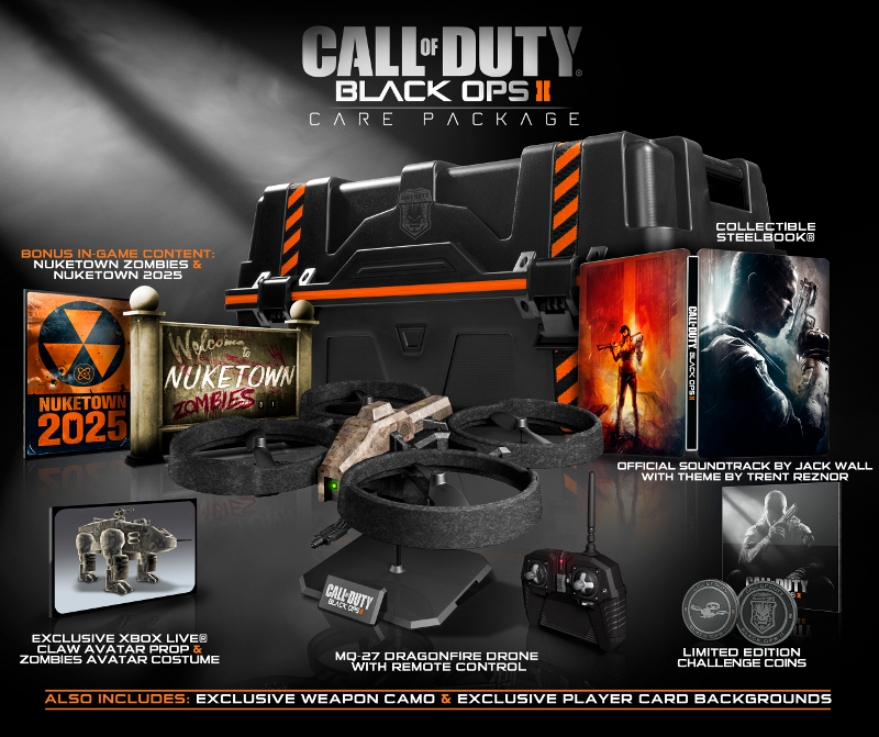 ![]() Call of Duty: Black Ops 2 MQ-27 Dragonfire на радиоуправлении Карта Nuketown Zombies - надавайте зомби в уже знакомой обстановке Карта Nuketown 2025 - сразитесь на знаменитой Nuketown во времена Black Ops 2 Steelbook, разукрашенный с обеих сторон Две "челенж" монеты - монеты, предоставляющие право скачать эксклюзивный контент Weapon Camo - эксклюзивная шкурка для вашего оружия в мультиплеере 2 коллекционные карточки, исполненные в стиле Nuketown Zombies и Nuketown 2025 Саундтрек Black Ops 2, к сожалению, в цифре А также клешню, которая будет показываться рядом с вашим аватаром и зомби костюм для него же на Xbox 360, или две динамические темы для Playstation 3 Упаковано всё это будет в огромный ящик ![]() Тож самое только без MQ-27 Стоить будут 179$ и 79$ Вполне неплохо по сравнению с прошлыми изданиями))) Хотя камера самолетику хорошего качества и низкий расход батареек не помешали бы)) Добавлено через 1 минуту А вот и превью: http://www.youtube.com/watch?v=7qQtC...layer_embedded