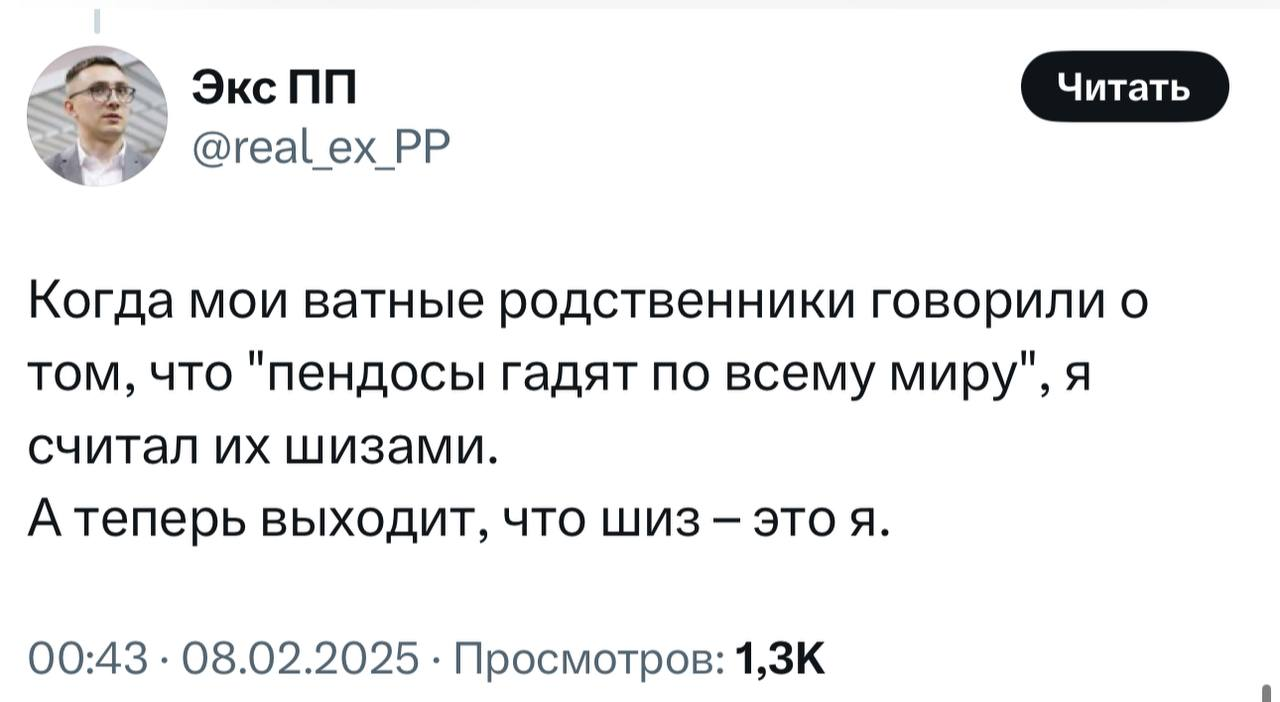Тут фишка даже в том что таких вот кто пишет что офигевают от того во что вписались и вляпались с разгону и что последние разоблачения usaid так-то дофига стало встречаться, это лишь из последнего что на глаза попалось. Для многих стало открытием что все это время "пропаганда кремля" говорила правду о том чьи уши за всем творящимся трындецом торчат, да и те кто поддерживал на серьезных щах майдаунов и другую хрень типа "нетвойняшек" тоже офигевают как заблуждались. Буквально недавно посты той же Латыниной попадались на сей счет. Многие конечно просто переобуваются, ибо флюгеры, но часть реально походу... прозрела что ли, если так можно выразиться.