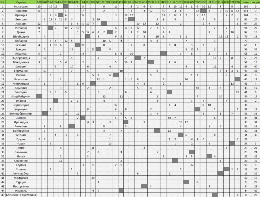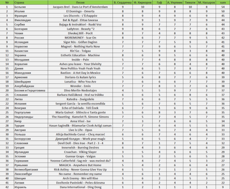 По решению оргкомитета (и просьбам зрителей) Евровидение-2020 перенесено из Нидерландов на форум Игромании и принять участие в нём может любой юзер форума. Формат очень простой. Есть участники (не более 13 человек) и есть жюри (не менее 10 человек). Есть список стран, которые разделены на три корзины. Каждому из участников с помощью рандома раздаются по 3 страны. В течении недели участник должен подобрать три композиции (желательно в виде клипа на ютубе) группы или исполнителя из этой страны и прислать в ЛС ведущему. То есть если вам выпали Испания, Чехия, Эстония, то вы и должны найти 3 клипа (в крайнем случае просто песни) групп/исполнителей из этих стран, по одному на страну (один клип испанской группы, один чешской и один эстонской) Через неделю все присланные клипы публикуются, а жюри оценивает их (опять же присылая оценки в ЛС ведущему). Оценка будет как на Евровидении - 12 баллов наиболее понравившейся композиции, 10 - второму месту, 8 третьему, и далее 7,6,5,4,3,2,1 балл. И так по всем трём корзинам. Жеребьевка состоится, после того как наберется нужно число участников. 1 корзина Скрытый текст: 2 корзина Скрытый текст: 3 корзина Скрытый текст: Состав участников: 1. Baldwin 2. фриранчик 3. Cyclops 4. Deetz 5. Льюс Терин 6. toymax 7. Athar 8. Ada_Wong 9. Sam & Leon 10. rubl 11. PrivateJoker 12. maxim 4rever Состав жюри 1. OldBoy 2. Майлз 3. Arhitecter 4. scrinn 5. Kentаvr 6. Pround Soul 7. Keykeeper 8. ShadowJack 1 корзина 2 корзина 3 корзина Приём песен заканчивается 5 апреля в 20-00 Голосование до 12 апреля