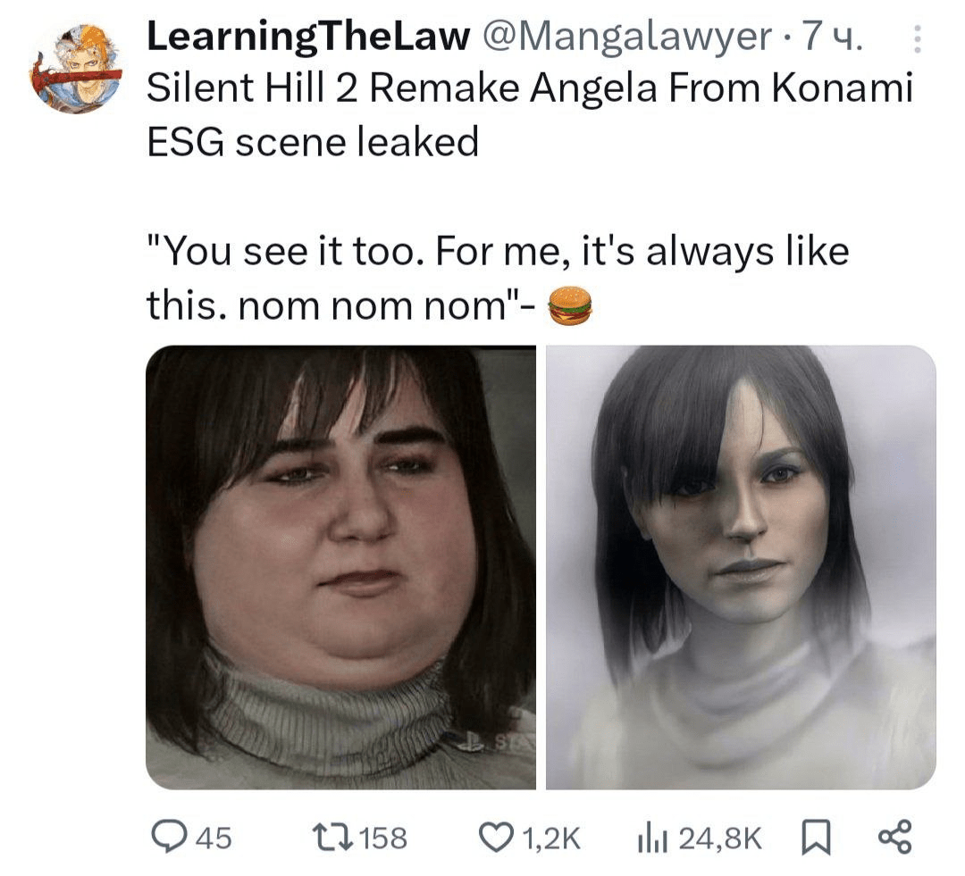 Джеймсу вроде физиономию немного подправили, но тоже такое, явно отличается от оригинального. Ну и да, Мария стала куда менее привлекательной, в сравнении с оригиналом, даже её юбка отстойт полный, а ведь она не просто так была в оригинале именно такой. Это было вполне обусловлено, ну вот какого хрена? Опять повесточка?Скрытый текст: Что касательно боёвки, то импакта от ударов стало вроде бы побольше, чем это показывали в обруганном ранее трейлере, но всё равно что-то не то с анимациями, видимо не смогут они докрутить этот аспект к релизу. Прям убого выглядят удары Джеймса по монстру палкой. Сражение с медсестрой тоже не впечатлило, ну вот эти анимации, эти выстрелы, ну почему так плохо? В остальном, выглядит в общем-то атмосферно и как нужно. Весь этот мусор, лужи на улице, какие-то появившиеся городские детали, пусть и незначительные, листовки там колышащиеся или музыкальные пластинки на магазине. Плюс мне понравилось, как Джеймс постоянно достаёт карту и делает в ней какие-то пометки, выглядит норм, записочки там берёт в руки и рассматривает, оружие и прочие предметы. Ну недурно, конечно, но на данный момент что-то всё равно настораживает. Где-то сделали два шага вперёд, а где-то два назад.Тем не менее игру скорее всего буду брать на релизе, так как несмотря на все шероховатости, я уже как-то соскучился по играм серии. Но у меня очень большие сомнения в плане продаж, сурвайвл хорроры и так то плохо продаются сейчас, за исключением серии RE, так ещё и сабж не так чтобы очень сильно заинтересует новую аудиторию, а на старых фанатах вряд ли получится выехать, тем более даже их сабж вполне может не заинтересовать, как мне думается. Вроде чё то там и стараются поляки, но подозреваю, что после выхода игры им больше никто и ничего не доверит, они кстати и без того-то на днях заявили, что у них в стопор встал новый проект, который они разрабатывали для Прайват Дивижн и теперь они ищут нового издателя для него, так как прежний послал их подальше. То ли с целью экономии, что сейчас повсеместно, то ли им совершенно не понравилось то, что поляки им представили и те в панике отказались.