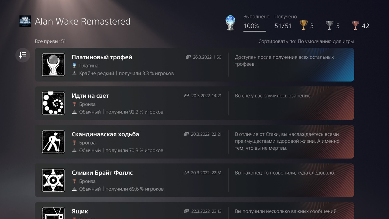 Ну это не слухи, это факт. В Death Stranding трофы автоматом вываливаются на 90%, остаётся только зачистить те, что для нового контента (там не долго). Правда, тут нужны сейвы на пс4, где у тебя 100%, и пс4-версия игры, в которой тебе нужно сделать "последнюю доставку" и перенести прогресс с пс4 на пс5 версию. Ну это бурят так заморочился, в других случаях, я думаю, должно быть всё попроще. Из того, что слышал, ещё в переиздании Тунчика на пс5 все трофеи вываливаются автоматом, но опять-таки, при наличии сейвов от пс4-версии. А так какой-то список таких игр есть тут. Но вообще, конечно, весь этот autopop вызывает некоторые сомнения. Лучше бы просто делали общие списки трофеев для пс4/пс5 и не парили мозги. |