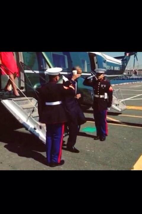 Обама отдал честь со стаканчиком с кофе в руке:
