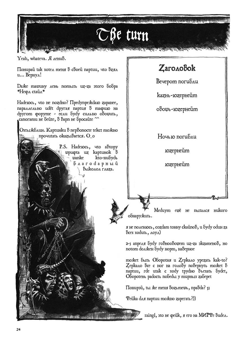 ![]() Газета. Скрытый текст: Список игроков. Скрытый текст: В игре участвуют: фон Фрюлинг - мафия 4 бандитов фон Фрюлинга - мафия Карл Лёвенцан - мафия-камикадзе Культист Ворона - оборотень Культист Излишеств - маньяк Сигмарит - Комиссар Чумной доктор - доктор Боевая подруга - путана Служитель древнего божества - зеркало Медиум - сенсор Заражённый варпом - камикадзе 11 мародёров - мирный Шпаргалка по геймплею. Скрытый текст: Правила для самой партии. Скрытый текст: Ну и на всякий пожарный общее пояснение по ролям. Мародёр послан всем, если кроме него есть ещё роль, то ты именно эта роль, если только мародёр, то мародёр. Пояснение по наказаниям. Т.к. я склеротик, то наказания до этого не работали, сейчас доношу до всех. 1 провинность - устное предупреждение. 2 провинность - автовыдвижение на казнь, и да это не освободит вас от овощеказни если вы можете попасть и туда. Вы просто будете в обоих списках. 3 провинность - выпил из игры. Ну и напоминалка, как может проверить сканер.